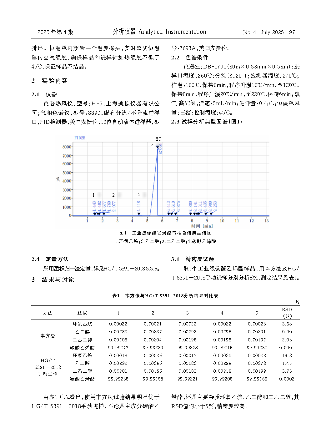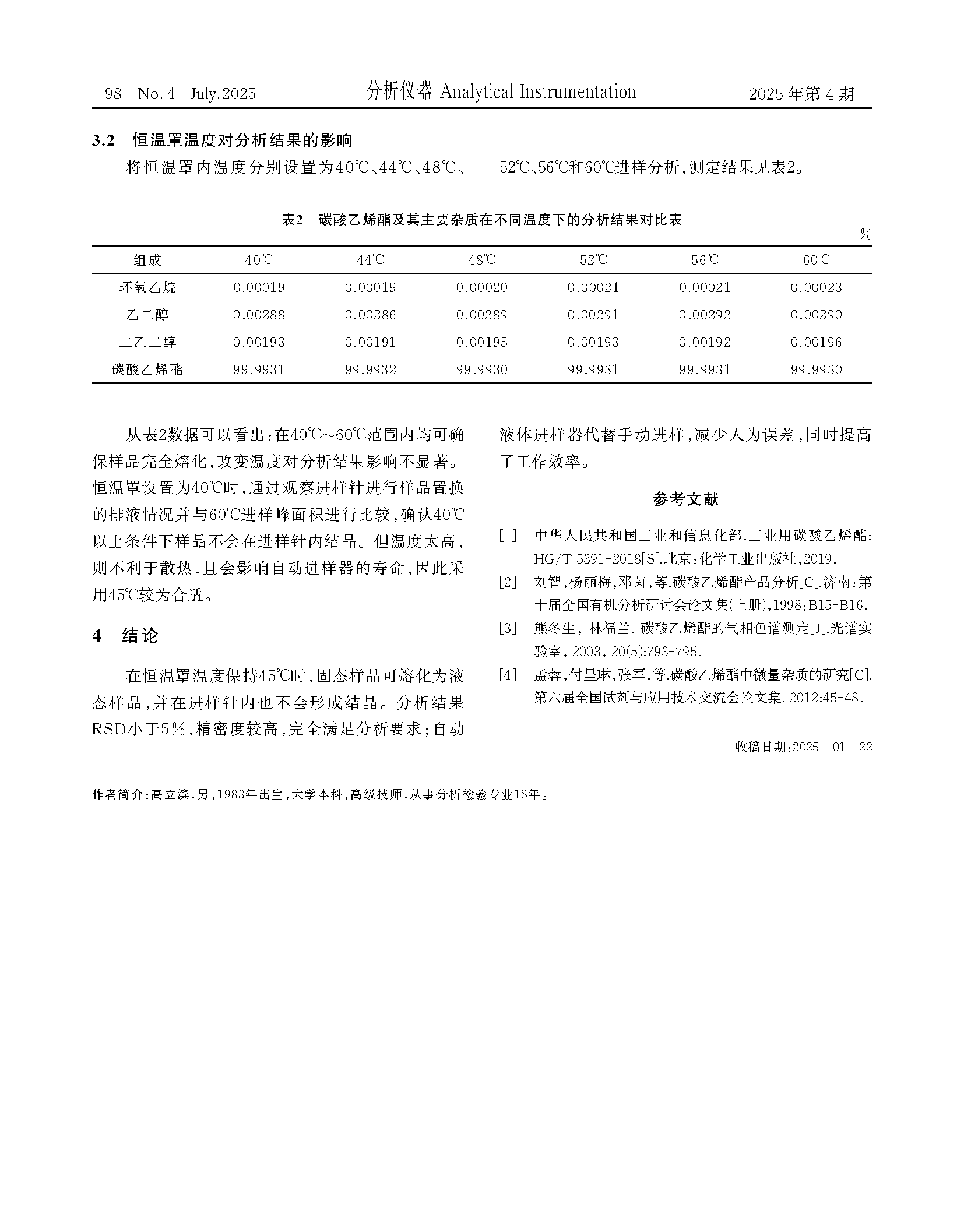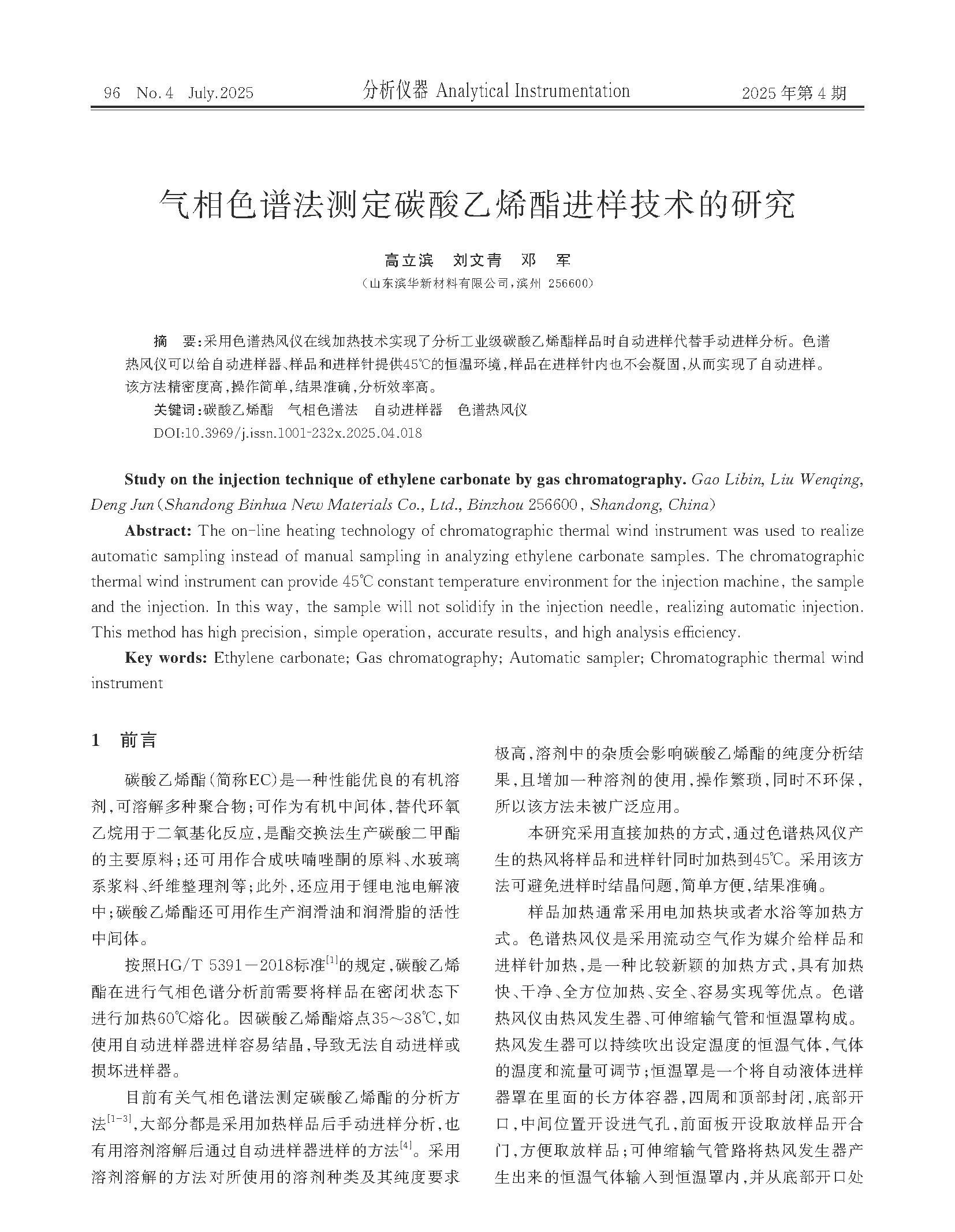 发表期刊:《分析仪器》,论文名称:《气相色谱法测定碳酸乙烯酯进样技术的研究》
